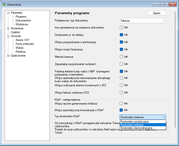 W rozwijanym menu Typ środowiska KSeF wybierz jedną z opcji, zależnie od potrzeb: