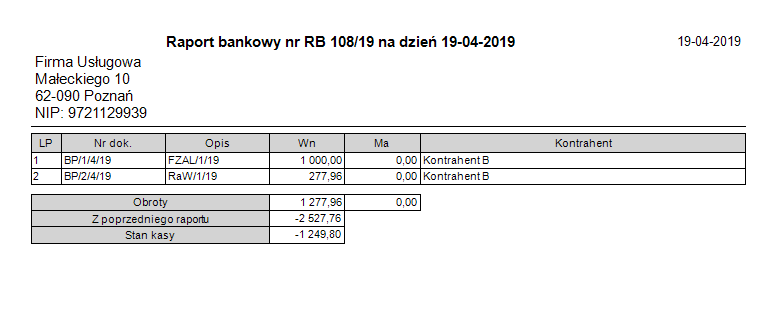 Raport kasowy / bankowy drukowany jest na określony dzień.