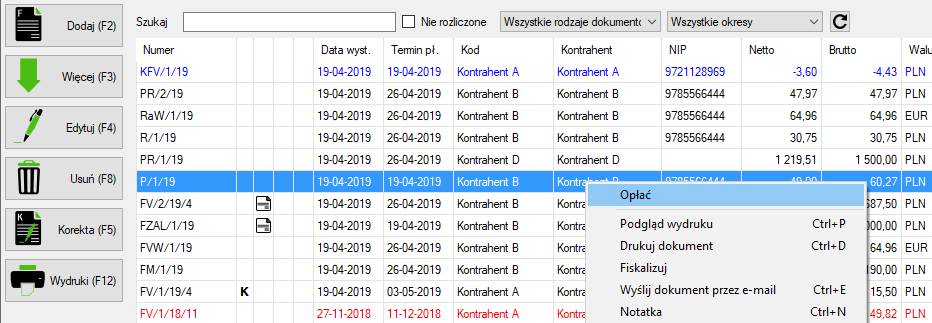 Drugą metodą rozliczania płatności za faktury jest ich rozliczanie bezpośrednio z poziomy listy dokumentów sprzedaży/zakupów.
