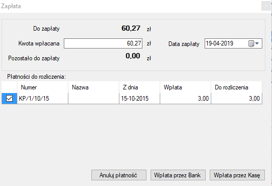 Zaznaczamy na liście dokument, który chcemy opłacić i klikamy prawym przyciskiem myszki i wybieramy z menu Opłać. Otworzy się okno do wprowadzenie wysokości kwoty wpłacanej, datę kiedy została ona dokonana i w celu zatwierdzenie zapłaty klikamy na Bank lub Kasa.