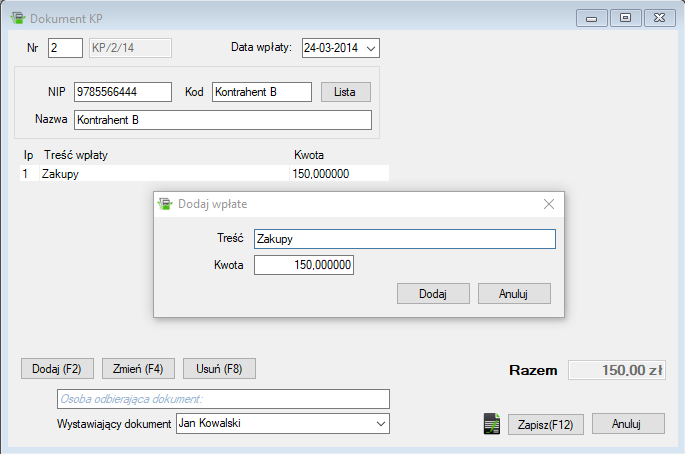 Przygotowanie nowego dokumentu odbywa się za pomocą przycisku Dodaj(F2). Wywoływane jest okno wyboru kontrahenta. Wybieramy właściwego i przechodzimy do edycji wpłat.