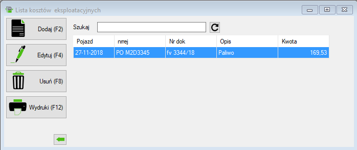 Lista kosztów eksploatacyjnych służy do ewidencji kosztów użytkowania pojazdów w firmie. Wprowadzamy koszty takie jak zakup palia, części eksploatacyjne itp.