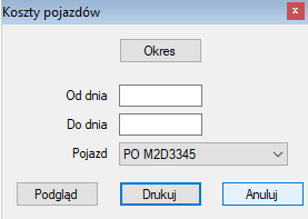 Wybieramy okres czasowy oraz pojazd dla jakiego ma być wykonany wydruk. Aby podejrzeć wygląd wydruku klikamy na przycisk Podgląd lub drukujemy bezpośrednio na drukarce klikając na przycisk Drukuj.