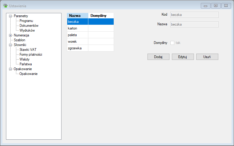Okno edycji pozwala na dodawanie, usuwanie i edytowanie Opakowań dla dokumentów CMR. Składa się ono z podglądu po lewej oraz pól edycji po prawej. Jeśli istnieje potrzeba dodania nowego opakowania naciskamy przycisk Dodaj. Pola po prawej staną się aktywna i możliwe stanie się wprowadzenie nowego opakowania. W celu poprawienia opakowania zaznaczamy je na liście a następnie naciskamy Edytuj. Po wprowadzeniu zmian należy zawsze zapisać zmiany.