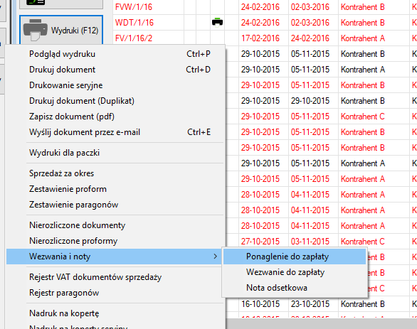 Aby wygenerować ponaglenie do zapłaty należy na liście dokumentów zaznaczyć niezapłacone dokumenty jednego kontrahenta i kliknąć na przycisk Wydruki a następnie wybrać Wezwanie i noty -> Ponaglenie do zapłaty.