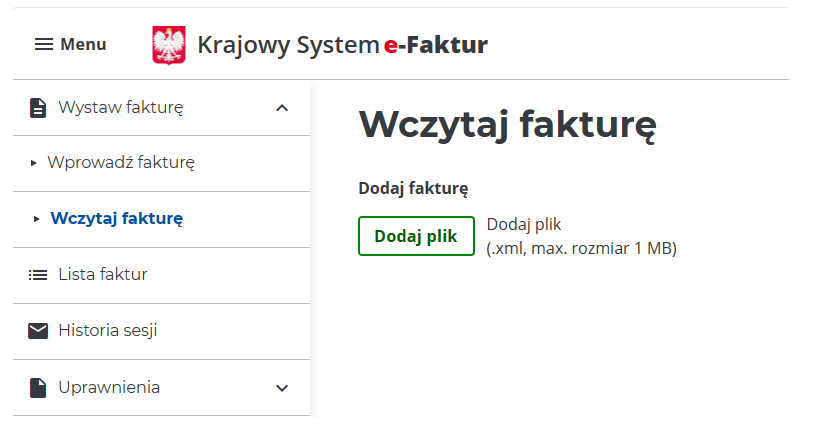 - Następnie wybieramy zakładkę Wystaw fakturę i Wczytaj fakturę i klikamy na Dodaj plik. Wyszukujemy na dysku zapisany wcześniej pliki xml z eFakturą.