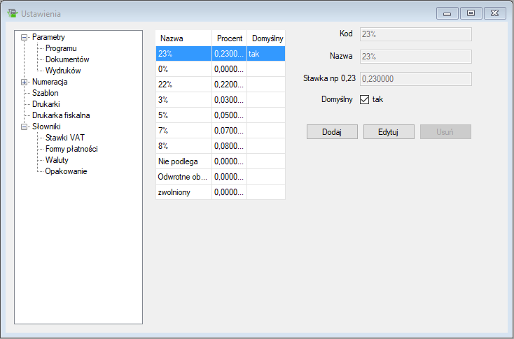 Okno edycji pozwala na dodawanie, usuwanie i edytowanie stawek VAT. Składa się ono z podglądu po lewej oraz pól edycji po prawej. Jeśli istnieje potrzeba dodania nowej stawki VAT naciskamy przycisk Dodaj. Pola po prawej staną się aktywna i możliwe stanie się wprowadzenie nowej stawki. W celu poprawienia stawki zaznaczamy ją na liście a następnie naciskamy Edytuj. Po wprowadzeniu zmian należy zawsze zapisać zmiany.