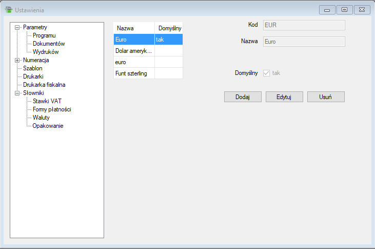 Okno edycji pozwala na dodawanie, usuwanie i edytowanie walut. Składa się ono z podglądu po lewej oraz pól edycji po prawej. Jeśli istnieje potrzeba dodania nowej waluty naciskamy przycisk Dodaj. Pola po prawej staną się aktywna i możliwe stanie się wprowadzenie nowej waluty. W celu poprawienia waluty zaznaczamy ją na liście a następnie naciskamy Edytuj. Po wprowadzeniu zmian należy zawsze zapisać zmiany.