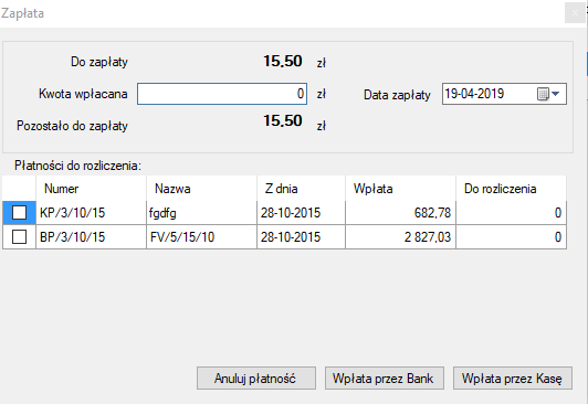 Wprowadzamy określoną kwotę jaką kontrahent wpłacił i wybieramy przycisk Wpłata przez Bank jeżeli płatność została wykonana przez konto bankowe albo przycisk Wpłata przez Kasę jeżeli klient zapłacił gotówką. Jeżeli dokument nie jest opłacony (termin płatności ) wybieramy przycisk Klient nie dokonał płatności.