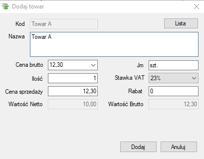 Po wybraniu towaru pojawi się okno z możliwością zmiany opisu towaru, wpisania lub wybraniu ceny podstawowej produktu (cena netto/brutto), od której wyliczany jest ewentualny rabat. Wprowadzamy ilości sprzedawanego produktu oraz cenę sprzedaży . Przy wpisaniu ceny sprzedaży od ceny netto/brutto zostaje automatycznie obliczony procent rabatu i analogicznie wpisanie rabatu zostanie automatycznie zmieniona cena sprzedaży.