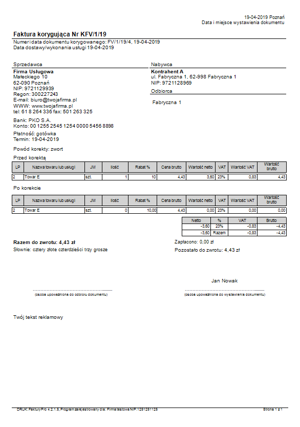 Na korekcie dokumentu możemy skorygować ilość, cenę lub stawkę VAT pozycji towarowej, nazwę towaru i jednostkę miary. Można również skorygować dane nabywcy.