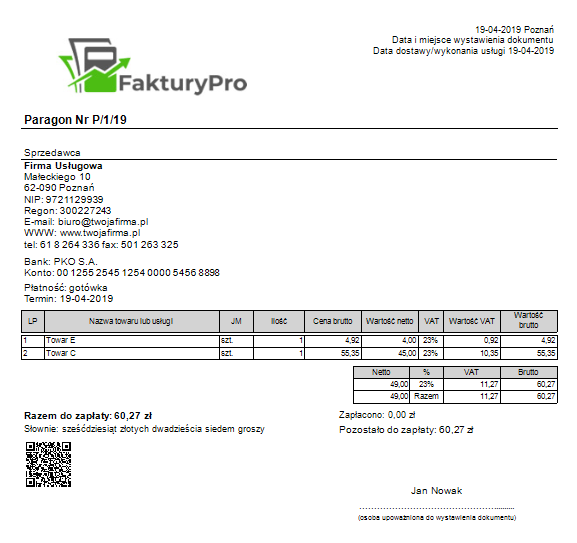 Dokument Paragon zawsze jest wystawiany i obliczany VAT od kwot brutto.