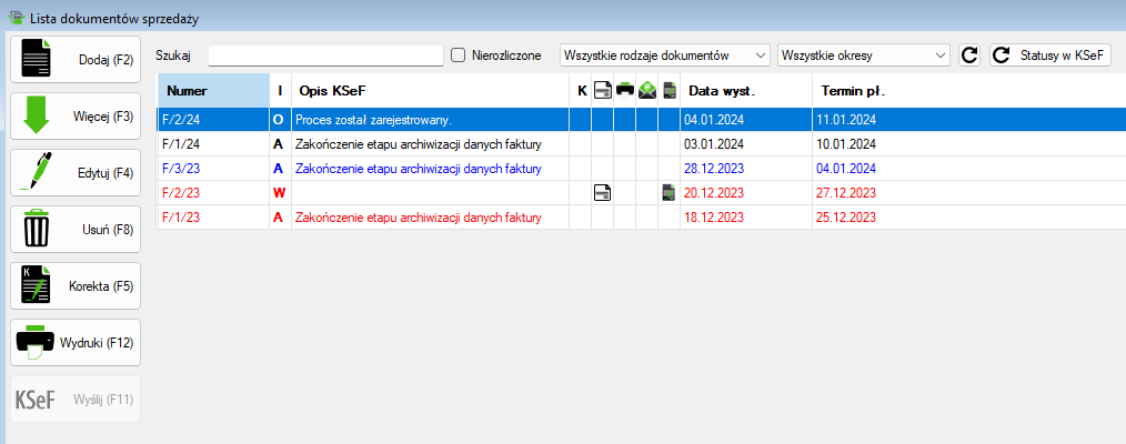 - Po inicjowaniu procesu wysyłania, status faktury na liście dokumentów powinien się zmienić: