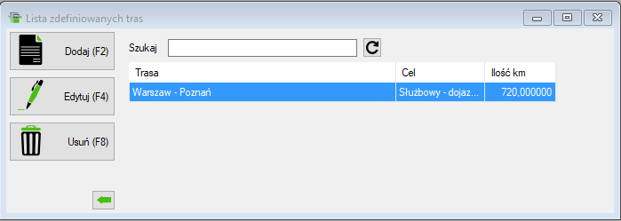 Dodajemy nową trasę przez wybranie przycisku Dodaj lub klawisza F2.