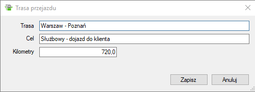 Wprowadzamy opis trasy, cel oraz ilość kilometrów.