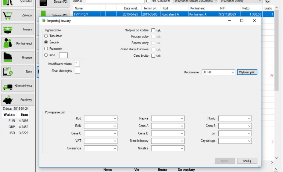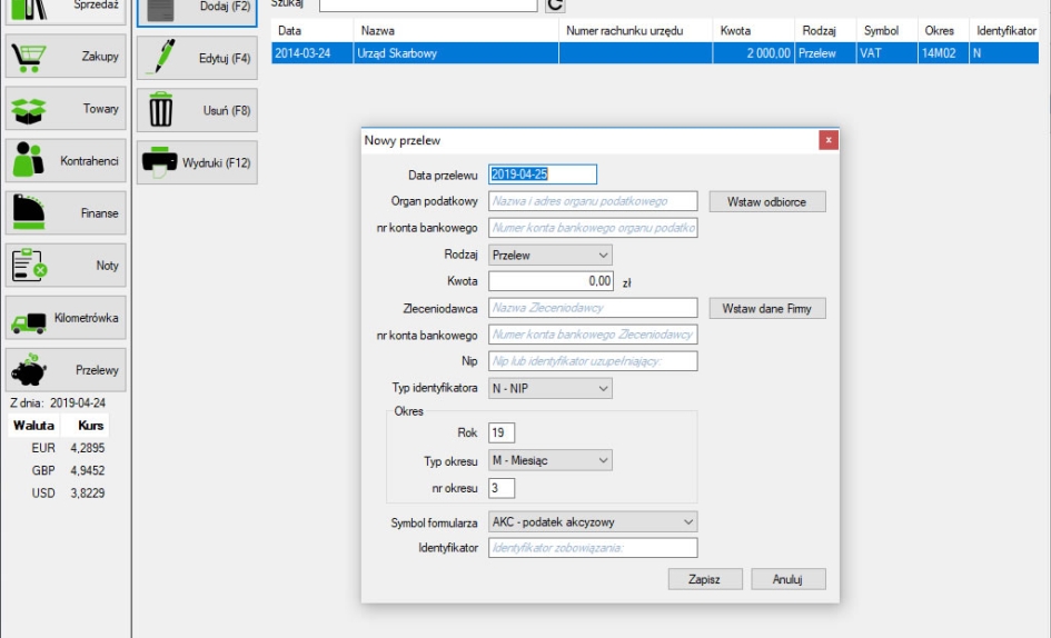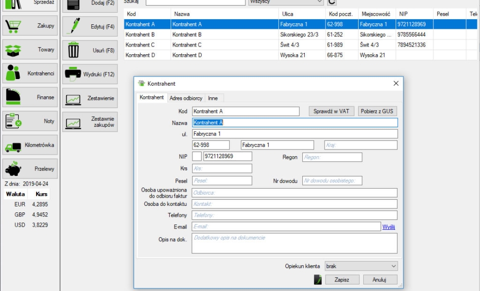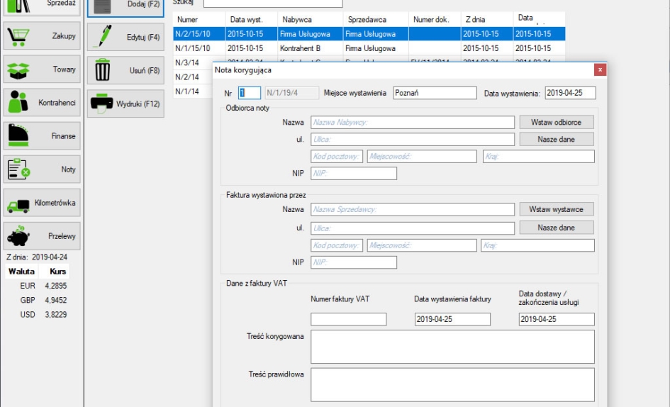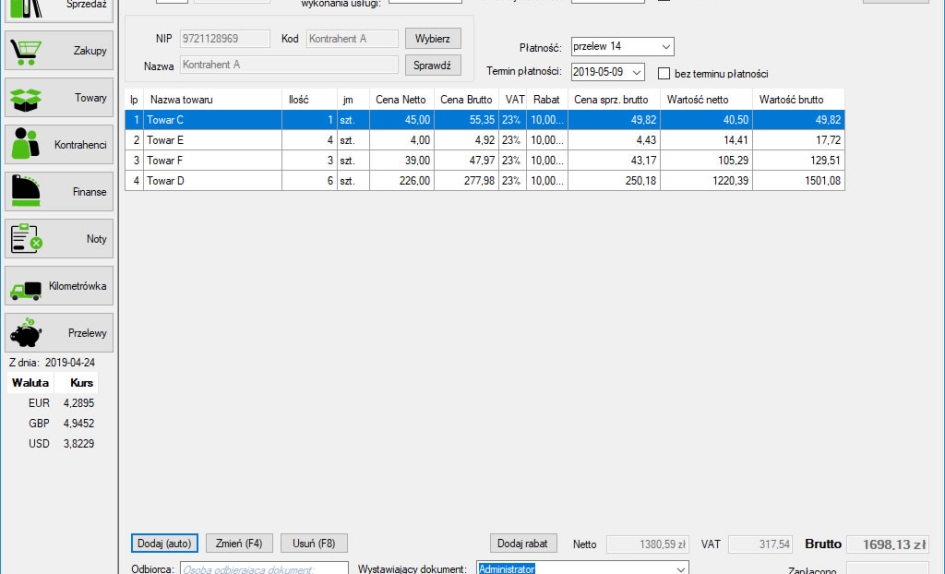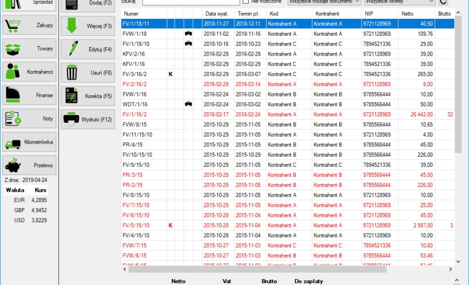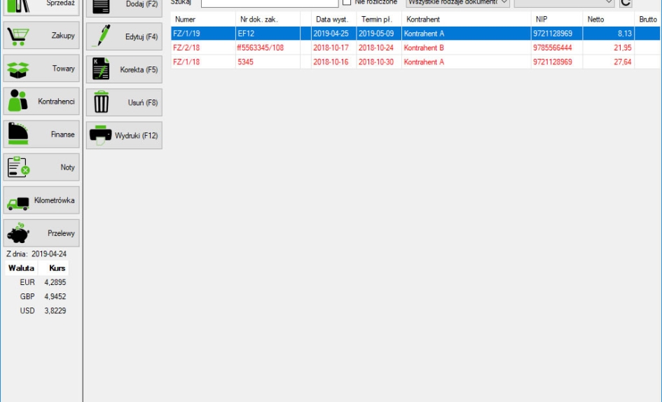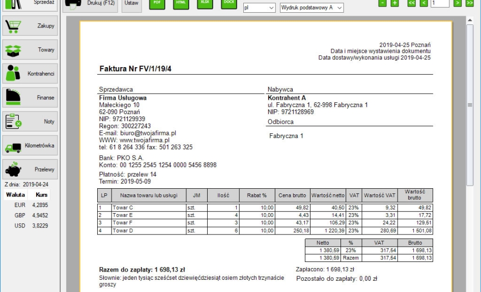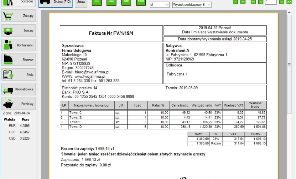 Automatyczny moduł KSeF (od wersji Pełnej) - wysyłanie e-faktur, pobieranie nr KSeF wysłanego dokumentu. Pobieranie listy faktur zakupowych, podmiotu trzeciego oraz własnych sprzedażowych, wydruk pobranych dokumentów z KSeF.Możliwość wystawiania dokumentów z danymi Wystawcy, Sprzedawcy, Nabywcy oraz Odbiorcy. Dokumenty sprzedażowe można utworzyć na podstawie innego dokumentu co pozwala na skrócenie czasu wystawiania podobnych faktur oraz wydruk faktury wraz z blankietem wpłaty za fakturę.