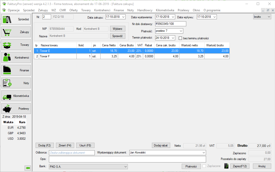 Po wybraniu kontrahenta na dokumencie pojawią się jego dane.