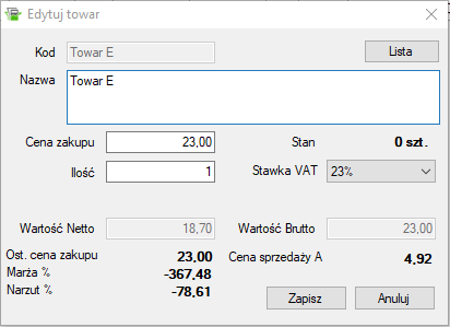 Dodatkowo zawarta informacja o stanie aktualnym towaru oraz ostatniej cenie zakupu i aktualnej cenie produktu. Przy wprowadzeniu ceny zakupu obliczany jest procent marży i narzutu w stosunku ceny sprzedaży.