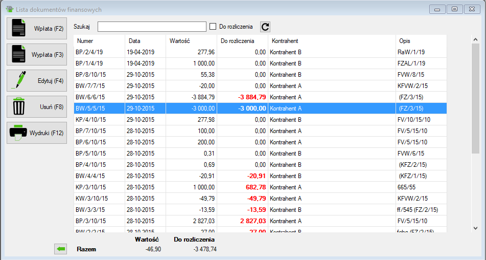 Na liście znajdują się dokumenty dla wybranego kontrahenta jakie nie są opłacone. Zawarta jest informacja o terminie płatności, dacie wystawienia i numerze dokumentu oraz jaka kwota pozostała do opłacenia.