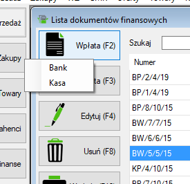 Wprowadzając wpłatę lub wypłatę przez moduł Finanse klikamy na przycisk Wpłata (F2) lub Wypłata (F3). Następnie wybieramy czy ma to być wpłata/wypłata realizowana przez bank lub kasę.