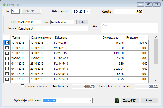 Następnie wybieramy jaki kontrahent dokonuje wpłatę. Po wybraniu kontrahenta otwiera się okno dokumentu wpłaty/wypłaty.