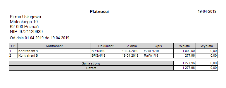 Raport kasowy za okres służy do wydruku listy wpłat i wypłat.