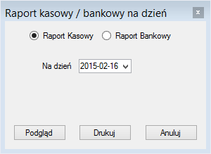 Raport kasowy / bankowy drukowany jest na określony dzień.