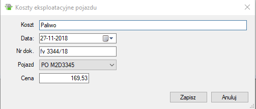 Prowadzamy rodzaj kosztu np: zakup paliwa, datę powstania kosztu, numer dokumentu nabycia. Wybieramy następnie wprowadzony wcześniej pojazd oraz wartość koszt w zł.