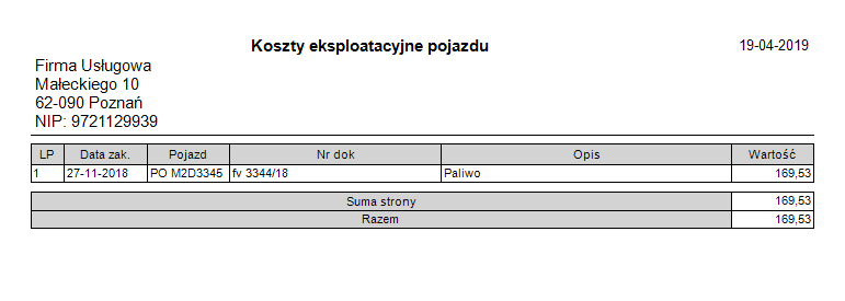 Przykład wydruku ewidencji kosztów eksploatacyjnych.