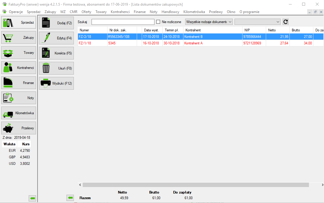 Lista dokumentów zakupowych