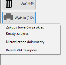 Wydruk (F12) - Po użyciu tego przycisku rozwija menu kontekstowe z listą możliwych wydruków: