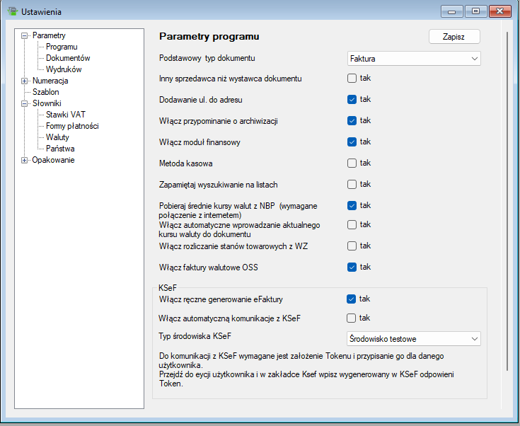 - Przejdź do menu Operacje -> Ustawienia -> Parametry programu.