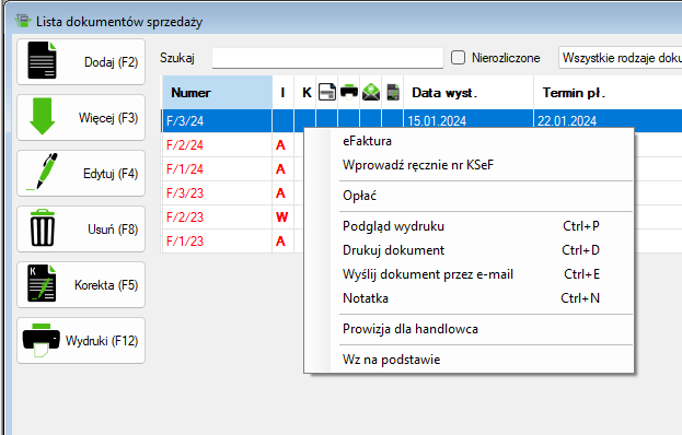 - Zaznacz wystawioną fakturę na liście dokumentów sprzedaży.