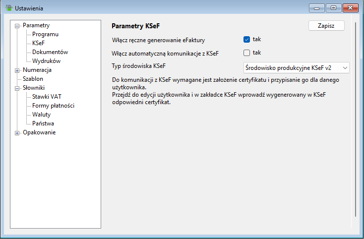 W sekcji dotyczącej KSeF zaznacz opcję Włącz ręczne generowanie eFaktury.