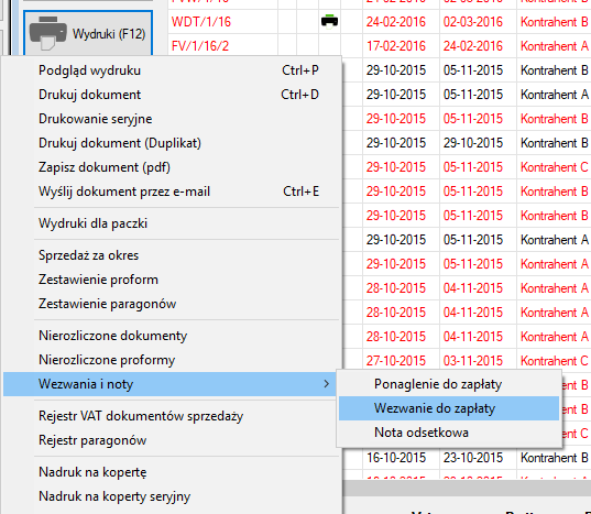Aby wygenerować wezwanie do zapłaty należy na liście dokumentów zaznaczyć niezapłacone dokumenty jednego kontrahenta i kliknąć na przycisk Wydruki a następnie wybrać Wezwanie i noty -> Wezwanie do zapłaty.