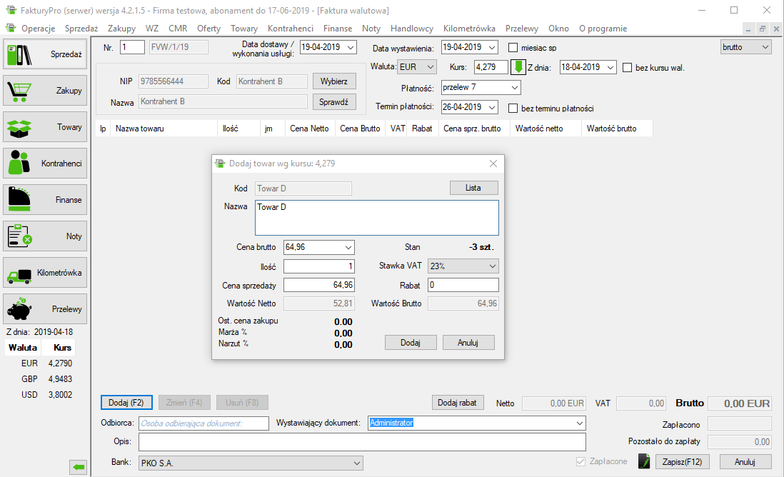 Po wprowadzeniu kursu każdy towar dodawany do dokumentu będzie automatycznie przeliczany wg kursu i dodawany już w walucie.