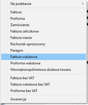 Wystawianie dokumentu faktura walutowa wykonuje się na liście dokumentów klikając na przycisk Więcej (F3) i z rozwijanego menu wybieramy Faktura w walucie.