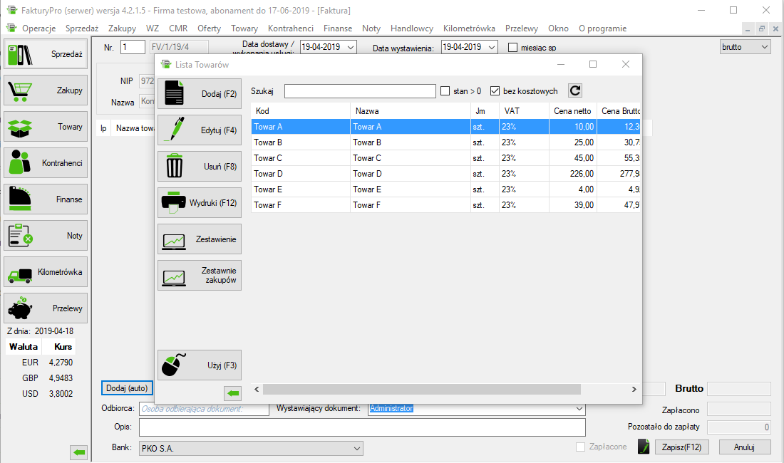 Po kliknięciu w Dodaj towar znajdzie się na liście w dokumencie.