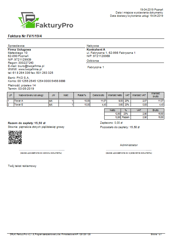Po zapisie nowego dokumentu zostanie wyświetlone okno z podglądem wydruku . Można wtedy taki dokument wydrukować lub zapisać do PDF lub HTML, XLSX i DOCX. Można wybrać również kilka wyglądów wydruku i języków.