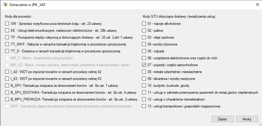 Kody GTU i kody dla procedur są eksportowane w plikach Format 3.0 i Edi ++ oraz w JPK_V7M dla programu księgowego, oraz drukowane na rejestrze sprzedaży VAT. Istnieje możliwość drukowania tych kodów na fakturze, wtedy w ustawieniach należy zaznaczyć pole Drukuj kody GTU