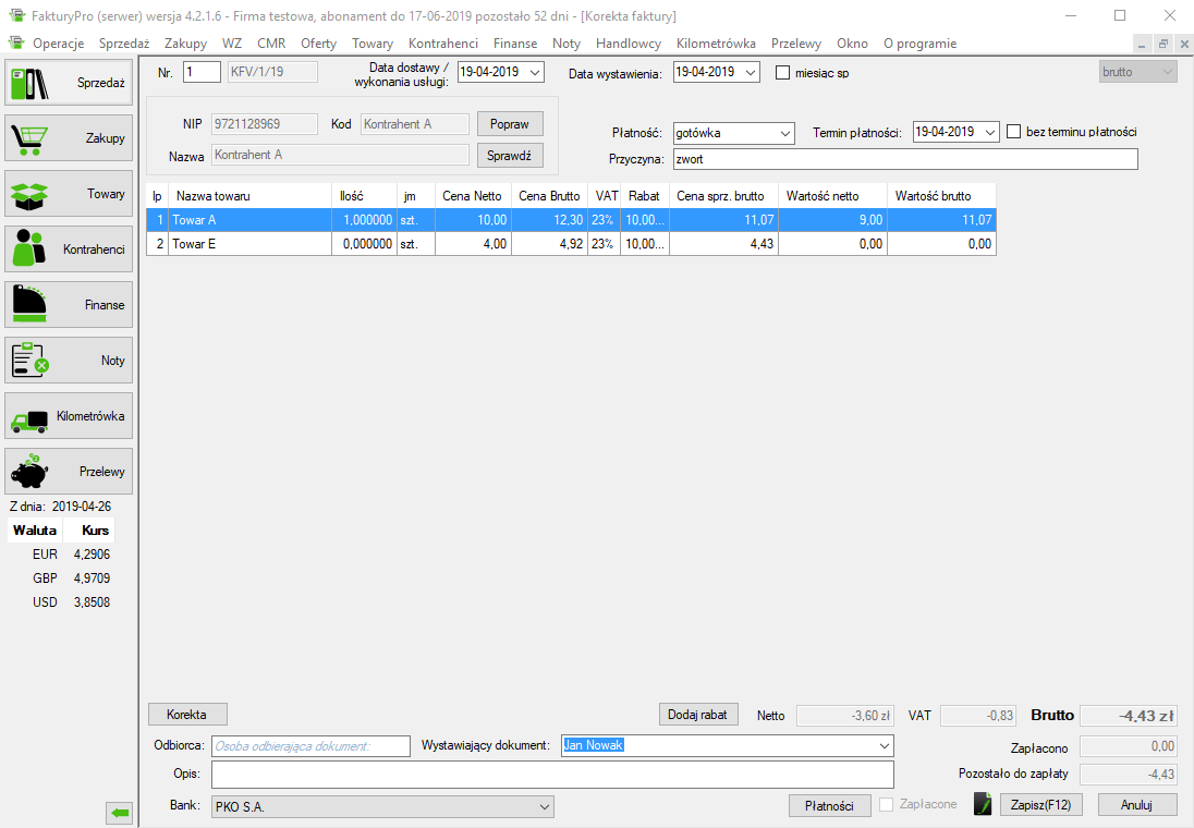 Na korekcie dokumentu możemy skorygować ilość, cenę lub stawkę VAT pozycji towarowej, nazwę towaru i jednostkę miary. Można również skorygować dane nabywcy.