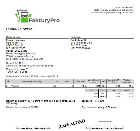 Dalej postępujemy analogicznie jak przy dodawaniu Faktury walutowej.