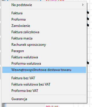 Wystawianie dokumentu wewnątrzwspólnotowa dostawa towarów wykonuje się na liście dokumentów klikając na przycisk Więcej (F3) i z rozwijanego menu wybieramy Wewnątrzwspólnotowa dostawa towarów.