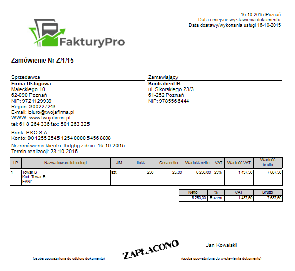 Przykład wydruku zamówienia.