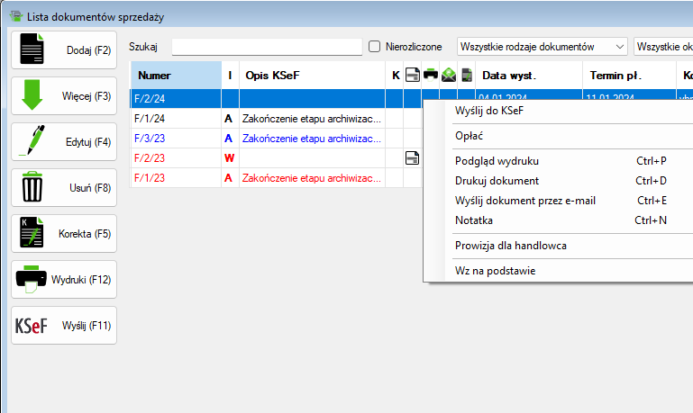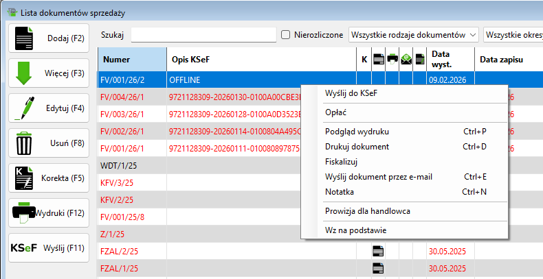 - Kliknij przycisk „KSeF” lub użyj prawego przycisku myszy i wybierz opcję „Wyślij do KSeF” z menu kontekstowego.