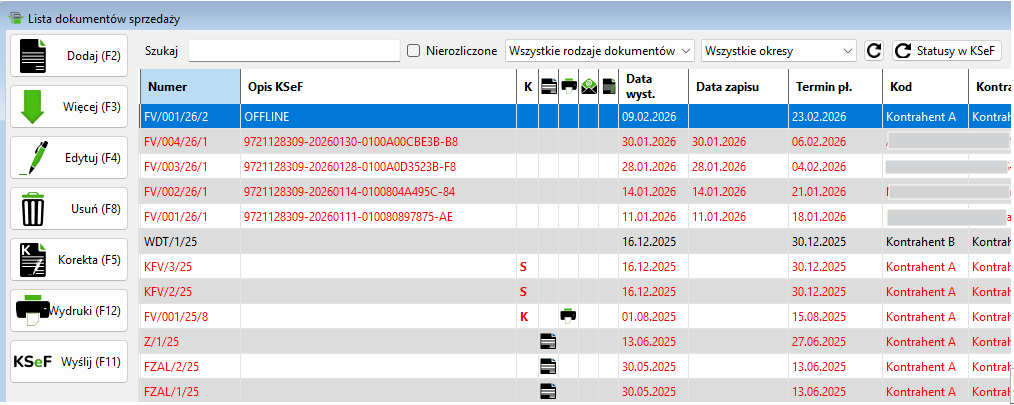 - „OFFLINE” - Dokument został wystawiony w trybie offline, z powodu braku internetu lub braku odpowiedzi KSeF, dokument musi być ponownie wysłany w 24 godziny, zostanie również automatycznie wysłany do KSeF podczas sprawdzania statusów , oraz przy uruchomieniu programu.